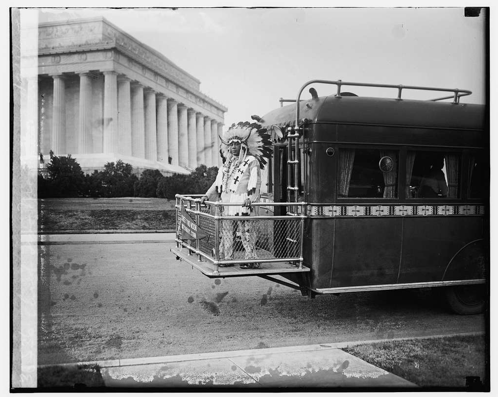 This rare 1925 image captures Chief Two Moon, a Native American medicine man and public figure, standing on a platform attached to a decorated bus. Behind him rises the iconic Lincoln Memorial, a symbol of American freedom and unity. The scene is not only historic but deeply symbolic. It brings together two powerful threads of our national identity — Native roots and the ideals of liberty.