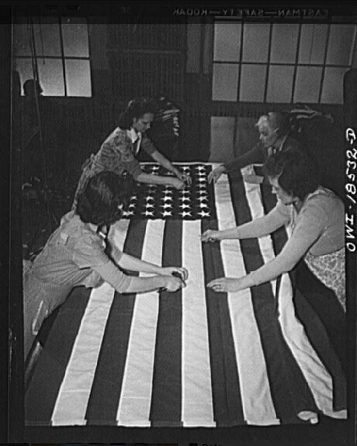As men went to war, women filled essential jobs at home. In factories across America, including in Verona, women made ammunition, stitched uniforms, and — as shown here — sewed flags that would fly proudly over bases, battleships, and ceremonies.